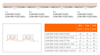 Indipendentemente dalle condizioni locali, le varie opzioni di montaggio di LOW BAY FLEX consentono sempre di trovare una soluzione semplice e professionale.