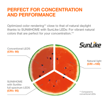 Saviez-vous que nous passons environ 90 % de la journée à l’intérieur et sans voir la lumière du jour ? Résultat : sommeil peu réparateur et mauvaise humeur. Un sommeil réparateur et une meilleure humeur nous rendent plus dynamiques et favorisent notre concentration. L’éclairage SUN@HOME avec LED SunLike agit comme la lumière naturelle du soleil et peut contribuer à améliorer votre bien-être physique. Son efficacité a été scientifiquement prouvée.*